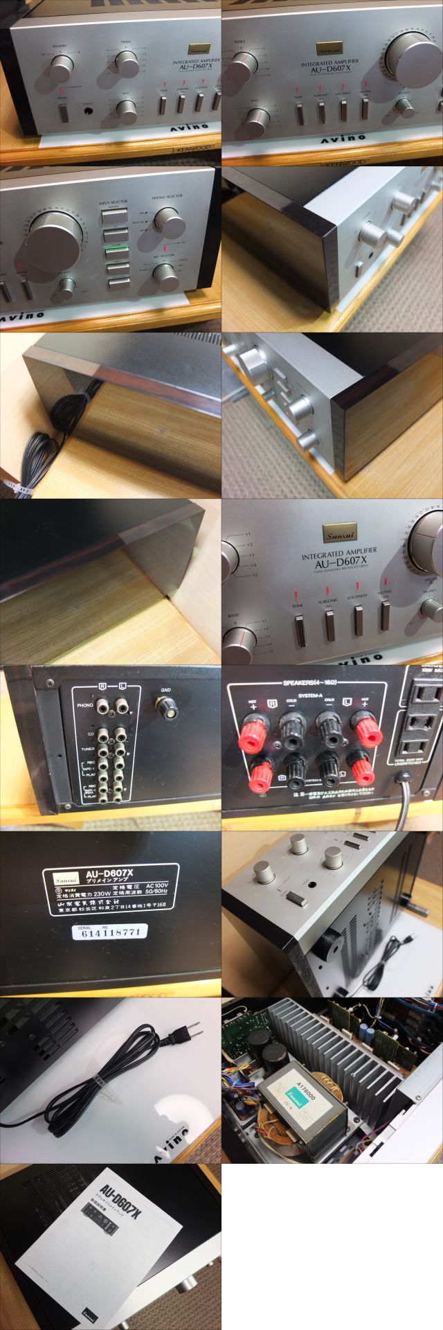 | ・・・ 名機 AU-D607X シルバーパネル 整備済み動作良品、音出し良好、キズ少なくキレイなアンプです 取説書コピー版付属 ・・・ メーカー: サンスイ 型番: AU-D607X 1984年頃 サイズ: 466㎜/ 161㎜ 431㎜/ 15㎏ 状態 * 整備で動作良好、音出し良好です * SW/VR類電子パーツクリーナーでクリーニング後、接点復活剤塗布 ガリ無く音出し良好です * パワー回路、DCバランス/バイアス調整済 * キャビネット、パネル、ツマミ分解クリーニング済 * パネル、ツマミ、キズ少なくキレイです * ボンネット、傷少なくキレイです * アンプ内部、基板もキレイです * 取説書コピー版付属 * 梱包、配送は破損の無いように致します * 商品到着次第「受取連絡」入力をよろしくお願いいたします。 | ||