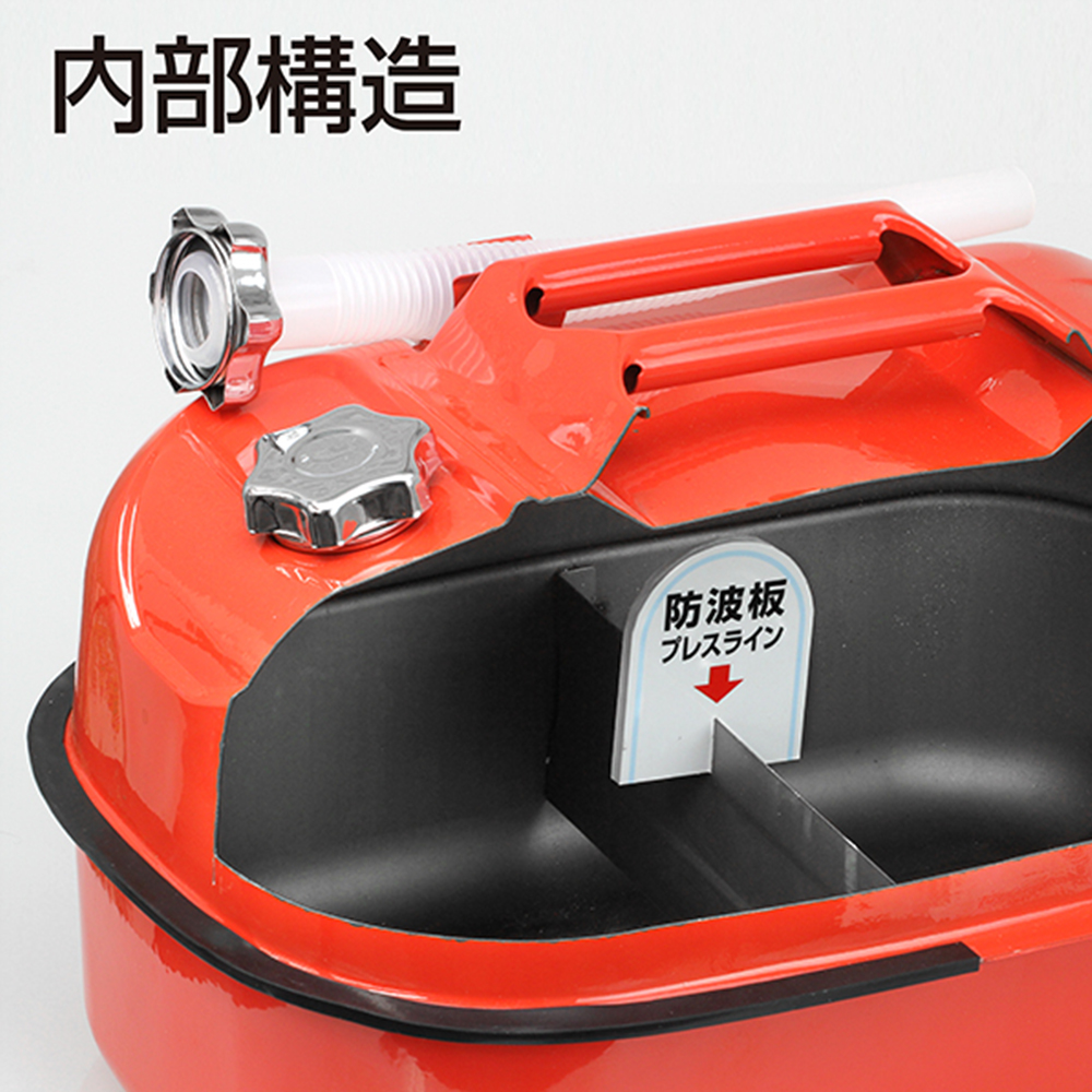 製品説明 | ■農機や建機などのガソリン補充用に ■国際基準(UN)適合、国際基準に基づいた容器性能試験に合格 ■手順違いによるガソリンの噴出事故を防ぐ手順番号ラベル付 ■鋼板厚0.8mm SPC鋼板使用 ■丈夫な金属製給油ノズル口金 ■給油時に注ぎやすいように底面形状を工夫 |