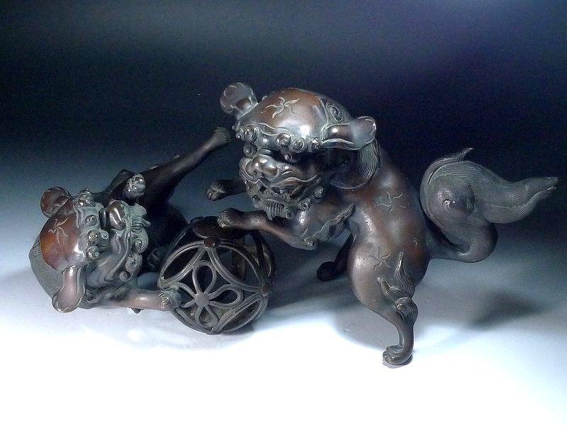 古銅製 獅子 置物 2点セット まとめて 像 玉乗り獅子 狛犬 縁起物 魔除け 厄除け 守り神 インテリア オブジェ 古美術 伝統工芸品