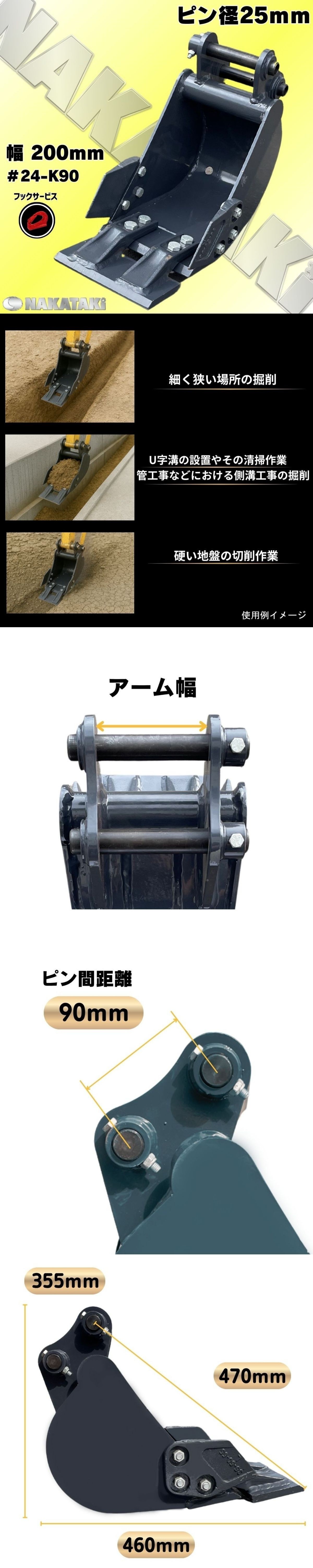 新品 幅狭 バケット 幅200ミリ ピン径25ミリコマツ, クボタ, 日立建機, CAT, IHI, ヤンマー, コベルコ, ハニックス, 北越工業 等適合