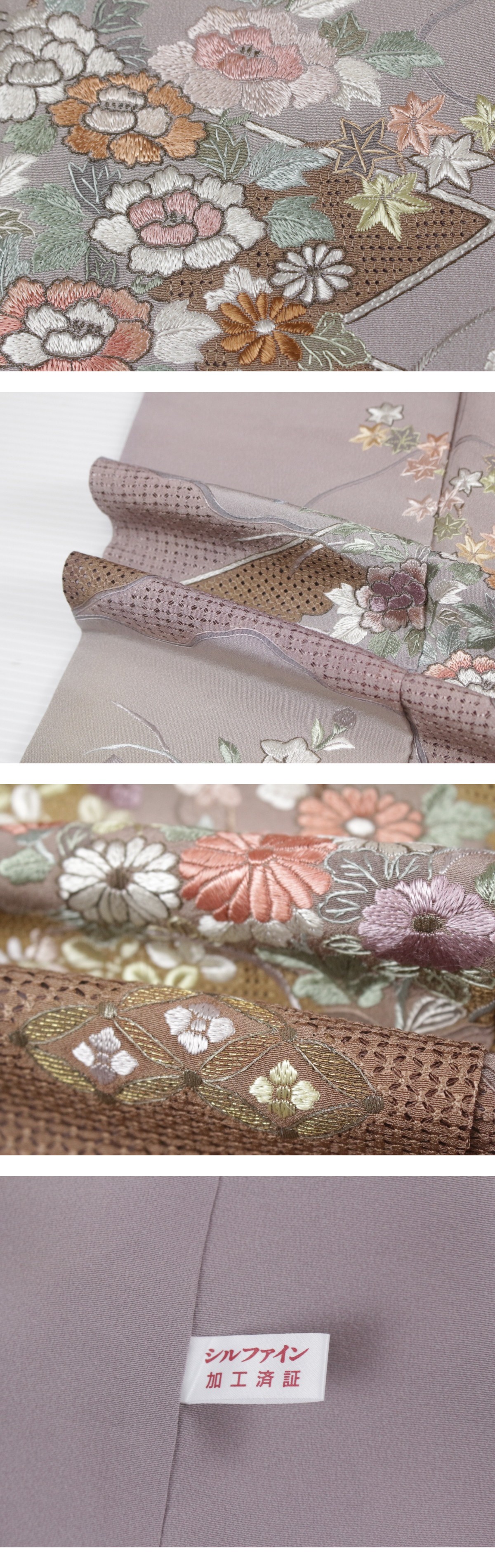 蘇州刺繍・汕頭刺繍が施された、正絹訪問着のご紹介です。 やわらかな灰桜色の地に、上品なぼかしが施され、裾まわりを彩る花々や几帳文様が格調高く表現された一枚。 精緻な蘇州刺繍による繊細な花弁の表現と、汕頭刺繍特有の透かし模様が織りなす陰影が、奥行きある華やぎを添えています。 刺繍の煌めきとやわらかな地色が調和し、洗練された着姿を演出してくれることでしょう。 晴れやかな場を気品高く彩る逸品。お目に留まりましたら、是非ご検討下さいませ。 ※撮影時の部屋の照明によって画像の色に若干の差がございます。色味に差がございますことをご了承のうえご検討下さいませ。 …状態… 胸元、裾内側にヤケあり。 ※全くの新品ではございませんので、記載のない変色やスレ、ヤケ、その他僅かな難がある場合がございます。そのような理由でのキャンセルはお受けできませんので、ご了承の上ご検討お願いいたします。 |