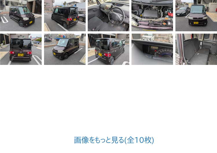 | ▼販売店コメント | ご覧頂きありがとうございます。即決落札価格ですべてコミコミです。 ★足代わりの軽自動車お探しの方に!■そのままお店に車を乗ってきて差し替えもOKです。今月の激安売り切りイベント。車検まだまだあり!タントVS 4WD入庫しました。ぜひこれを機にご購入ご検討ください!!年式の割にきれいな一台です。ストレスを感じない走りです、まだまだこれから走ります。程度いい1台です。なのでこれから長く乗られる方にいかがでしょうか?。入札前の事前の下見、試乗もOKです。車検ありなので即乗り!気に入った方はそのまま乗って帰ってもOKです。自分で名義変更できる方は落札価格のみでコミコミなのでかなりトータル的には安いと思います。即決希望の方はどしどしご連絡お待ちしております。ご自分で名義変更する方は車代のみで登録諸費用など余計なものは当社では頂きません、、もちろんコミコミ価格です。自賠責代等もコミコミです。。もちろん当社でも別途名義変更を承っております。■もちろん格安の陸送手配もできますのでぜひ問い合わせてみてください。メンテナンスされた車なのでご安心ください。ほかは車はとくに問題ありません。現在の価格ではリサイクル料金は別です。自動車税は完納ですがこれから来る自動車税のみ後日お願いします。 ■この車への「お問合せ」・「無料見積り依頼」、「在庫確認」は、お気軽にどうぞ!