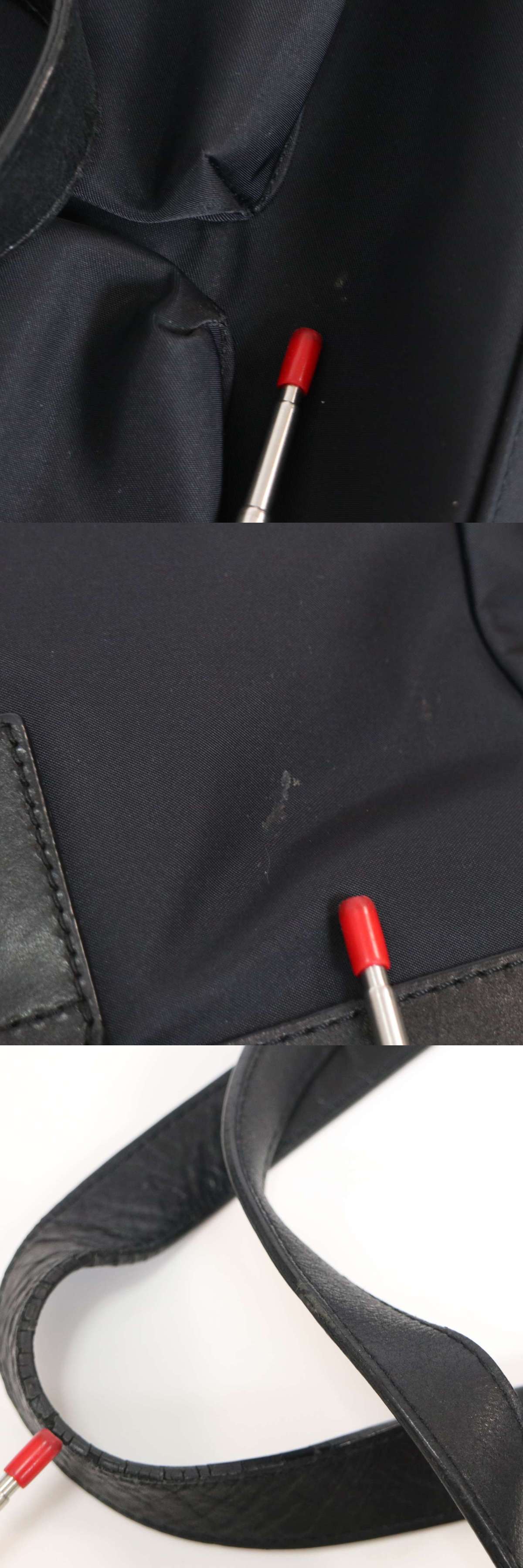 裏面と底にごく薄い汚れ、持ち手に軽いダメージがございます。着用に問題はございません。