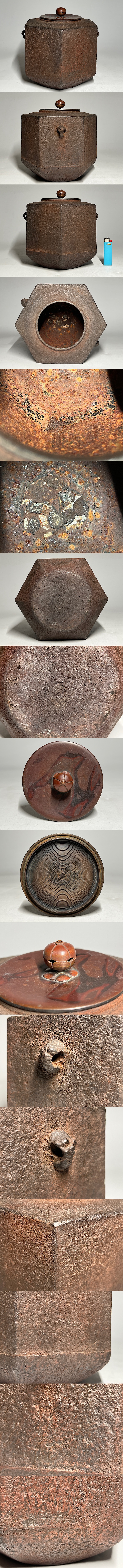 釜師造 六角形 鉄釜 茶道具 ◆商品詳細 寸法(約):20.5x18.9x10.6(摘みまでの高×耳まで幅x口径㎝) 蓋重さ:255g 総重量:3.6k g ※寸法に若干の誤差が生じる場合もございます。 水を24時間はりもれませんでしたが、 のちのご使用による水もれ、破損は保証できませんので、ご承知ください。 経年の汚れ、サビ、作成時にできたカタのへこみや、スジ、膨らみがあります。 底や、中の状態も含めて画像で確認の上各自の判断で入札お願いします。 上手な直し(釜補修)があった場合、見ただけでは当方もわかりませんので、 あると思って承知して入札して下さる方が良いと思います。 ◆発送先等のご連絡とお支払いについて ※発送先等のご連絡 落札時から48時間以内にお願い致します。 ※お支払 かんたん決済の期限内にお願い致します。 ※複数点落札時にまとめて取引の場合(72時間内)に、 まとめて取引の取引手順(落札者方の操作)を参考にお願い致します。 梱包したサイズを測って、地方によって送料を決めますので、よろしくお願いします。 ◆掲載画像について ※画像は現物を撮影しておりますが、照度、遮光、モニターによっては実物と 色目が異なって見えることがありますのでご注意ください。掲載画像では確認 できない傷や汚れがある可能性もございます、あくまで中古品であるというこ とをご承知の上、御入札をお願い致します。 ◆補償について 商品到着後はすぐに状態の確認をお願い致します。 商品の破損等がございまし たら、箱や梱包材など全てそのままの状態で保存し、お早めにご連絡ください。 (到着日から一週間以上経過、梱包材の廃棄済み等の場合、保証は致しかねます のでご注意ください。) ◆返品について 思っていたイメージと違う、などのお客様主観による返品はお受けできません ので、予めご了承ください。ノークレーム、ノーリターンでお願いします。届 いた商品が商品説明と著しく乖離している等、当店に原因のある場合には、お 早めにご連絡ください。 ◆注意事項 当方の希望価格と隔たりがある場合は、終了前にやむなく取下げさせて頂く場 合がございます。 ※商品ご落札翌日から4日間以内にご連絡が取れない場合は、入札取消の処置を 取らさせていただく場合がございます。 ※評価の悪い方は取り消す場合がございます。 ※原則として当方の不備以外のキャンセル・返品・返金は受け付けておりません。 以上の点を予めご了承頂いた上で、入札・落札お願い致します。 ◆発送方法 ▼ゆうパック(補償あり/追跡あり) 梱包後のサイズ:~80cm ※送料全国一律1,200円 (但し北海道、沖縄、離島は+500円いただきます。) 発送元は静岡県となります。 ( 商品の組み合わせによっては同梱をお断りさせていただく場合があります。) ※大型商品について 郵便局の規定を超える商品の場合は、佐川急便またはヤマトでの発送となります。 |