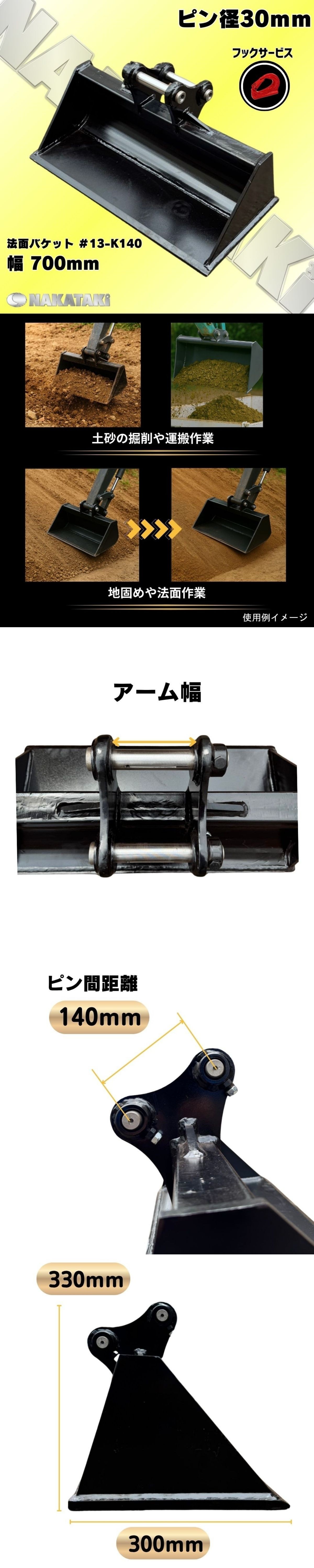 新品 法面 バケット 幅700ミリ ピン間距離140ミリ