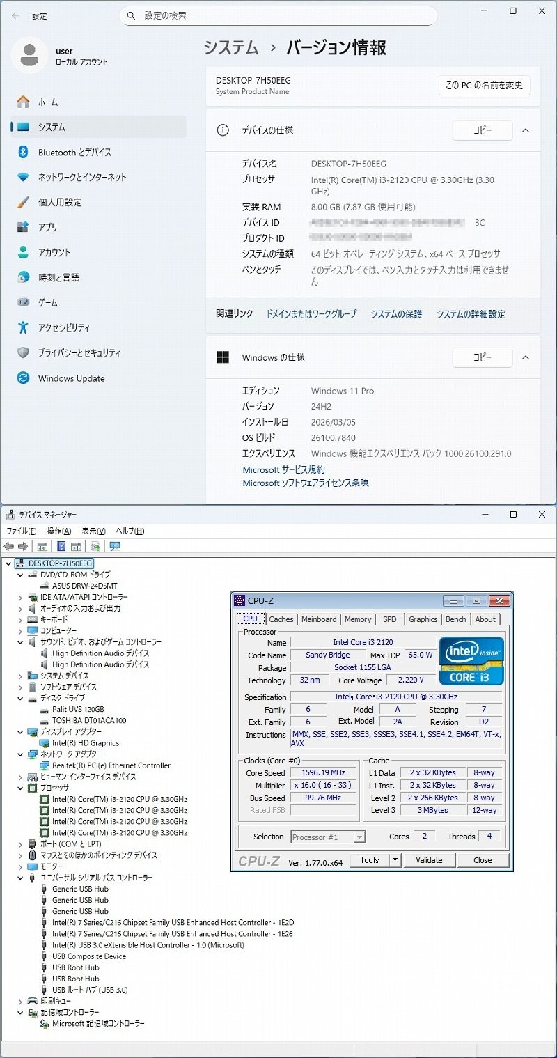□■ ASUS B75M-PLUS core i3-2120 3.30GHz SSD120GB HDD1TB 8GB Windows11 ■□