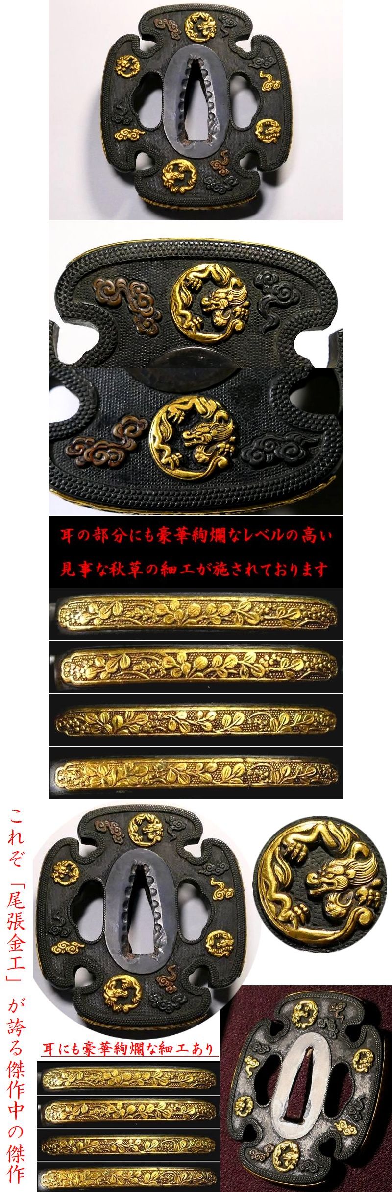 | 商品説明 | 金無垢と見紛う程の極上の金色絵に加え 繊細な魚々子細工の赤銅地に レベルの高い雨龍細工が散りばめられた 金工作品の傑作中の傑作と言える 一品でございます! 耳の部分にも 豪華絢爛な秋草細工が施されており 作行から見て 「尾張金工」の傑作と推測しております。 詳しくは画像にてご確認下さい。 ここまで見事な作品には 滅多に出会えないと思われます。 この機会をどうぞお見逃しなく! 寸法: 約 7.04cm × 約 6.34cm × 約 0.41cm (切羽台の厚み) 重量: 約 133.2グラム 時代: 江戸時代 材質: 最上級の赤銅に極上の魚々子細工 桐箱付 銘 : 無銘 状態:特に気になる傷みはなく良好。画像にてご判断下さい。 :許容範囲内の時代傷みはご理解下さい。 |