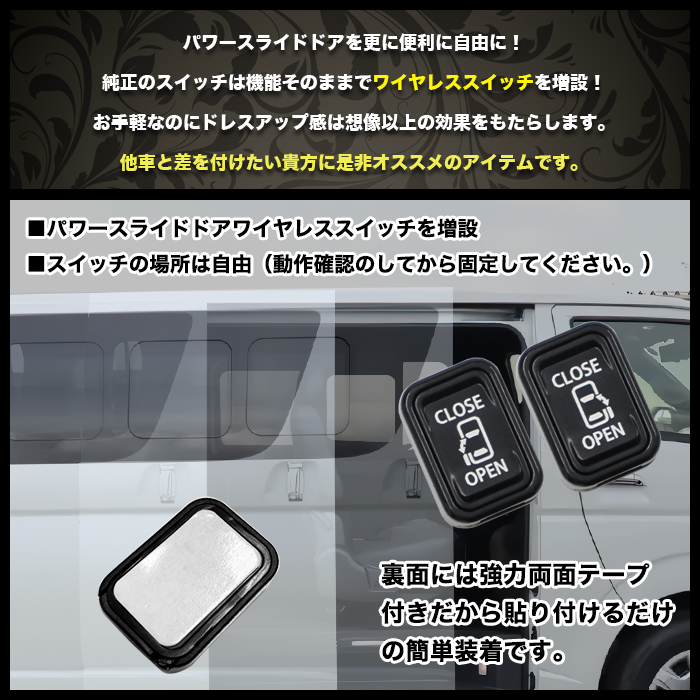 | 車種専用設計!カプラーオン設計で取付け楽々! 閉める際の不便さを簡単に解消! ドレスアップ効果抜群のアイテムです! ■適合:■適合車種 ・ハイエース 200系 ・レジアスエース 200系 ■年式:H25.12〜 ※両側電動スライドドア装着車のみ適合 自動ドア装着車以外は取り付けできません。 ■材質:ABS樹脂 ■両面テープ装着済み ■セット内容:配線キット×1 ユニットボックス×1 スイッチ×2(両面テープ付) ボタン電池×2 内張りはがし×1 結束バンド ※取付説明書等は付属しておりません。 ※取り付け等のサポートは承っておりません。予めご了承ください。 |