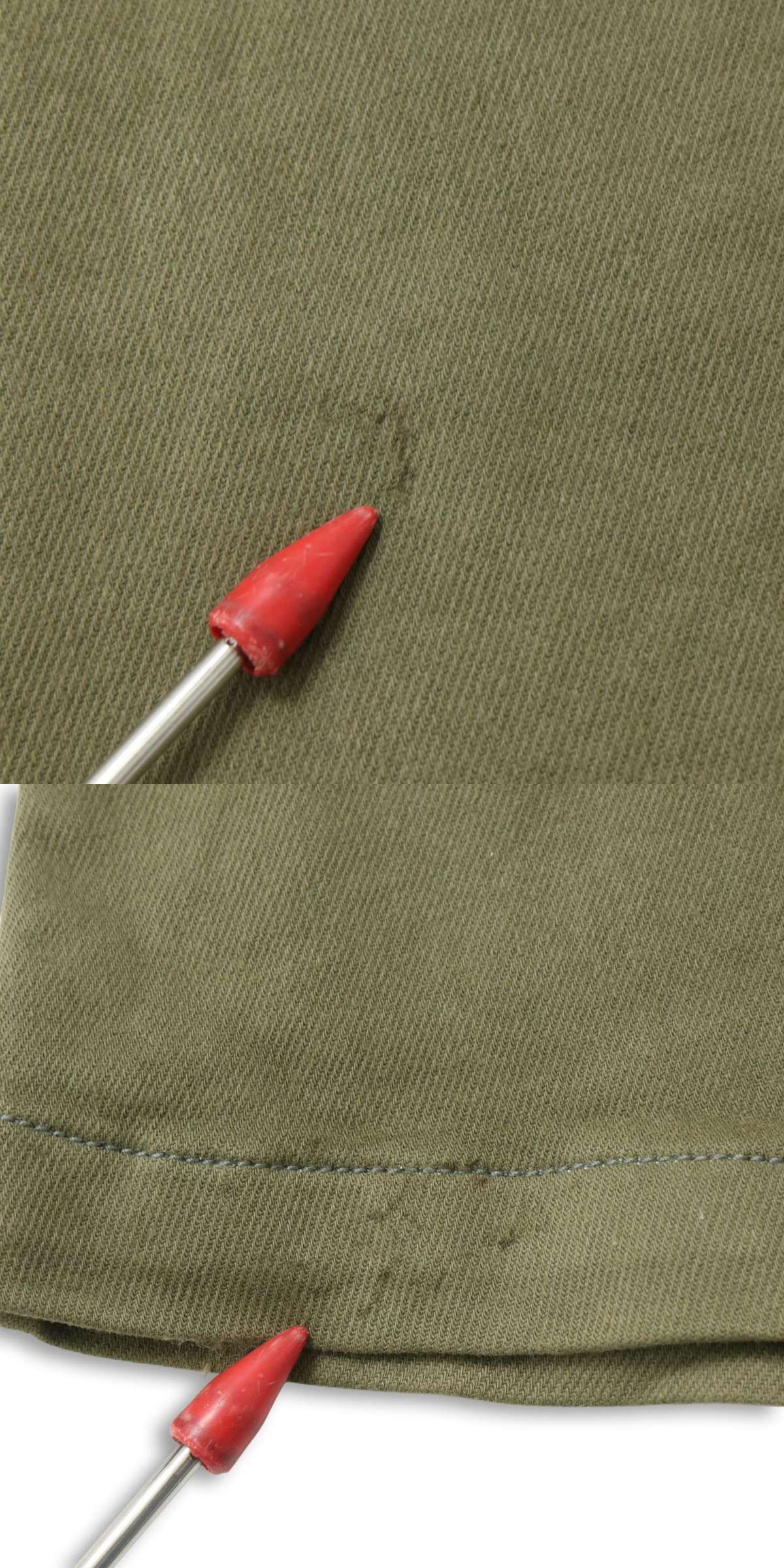 正面右すそ下部に極わずか薄い小さな汚れがございます。着用に問題はございません。