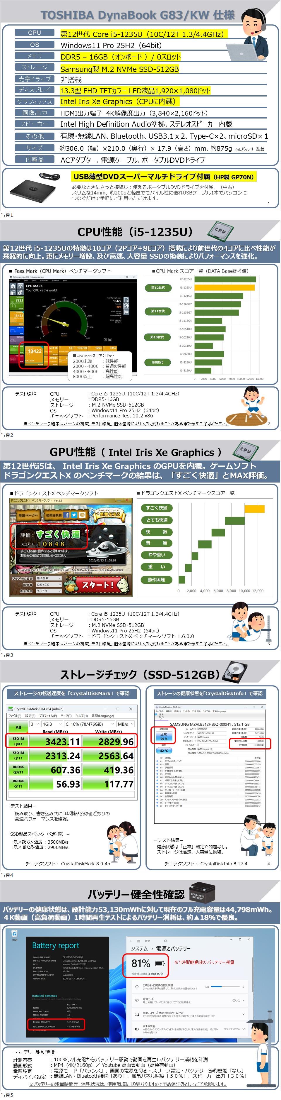 1)CPUは、第12世代 Core i5-1235Uを搭載。(前11世代のi7シリーズを大きく超える性能)