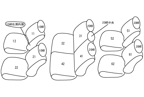| 適合形状 | オプションのシートヒーター/サイドエアバッグをどちらか、もしくは双方装備されている場合でも対応します。 どちらとも未装備でも対応します。 ※3列目格納機能に考慮して、3列目カバーは最小限の厚みにしています。 ※1列目アームレスト装備車は背もたれカバーに穴開け加工が必要です。 |