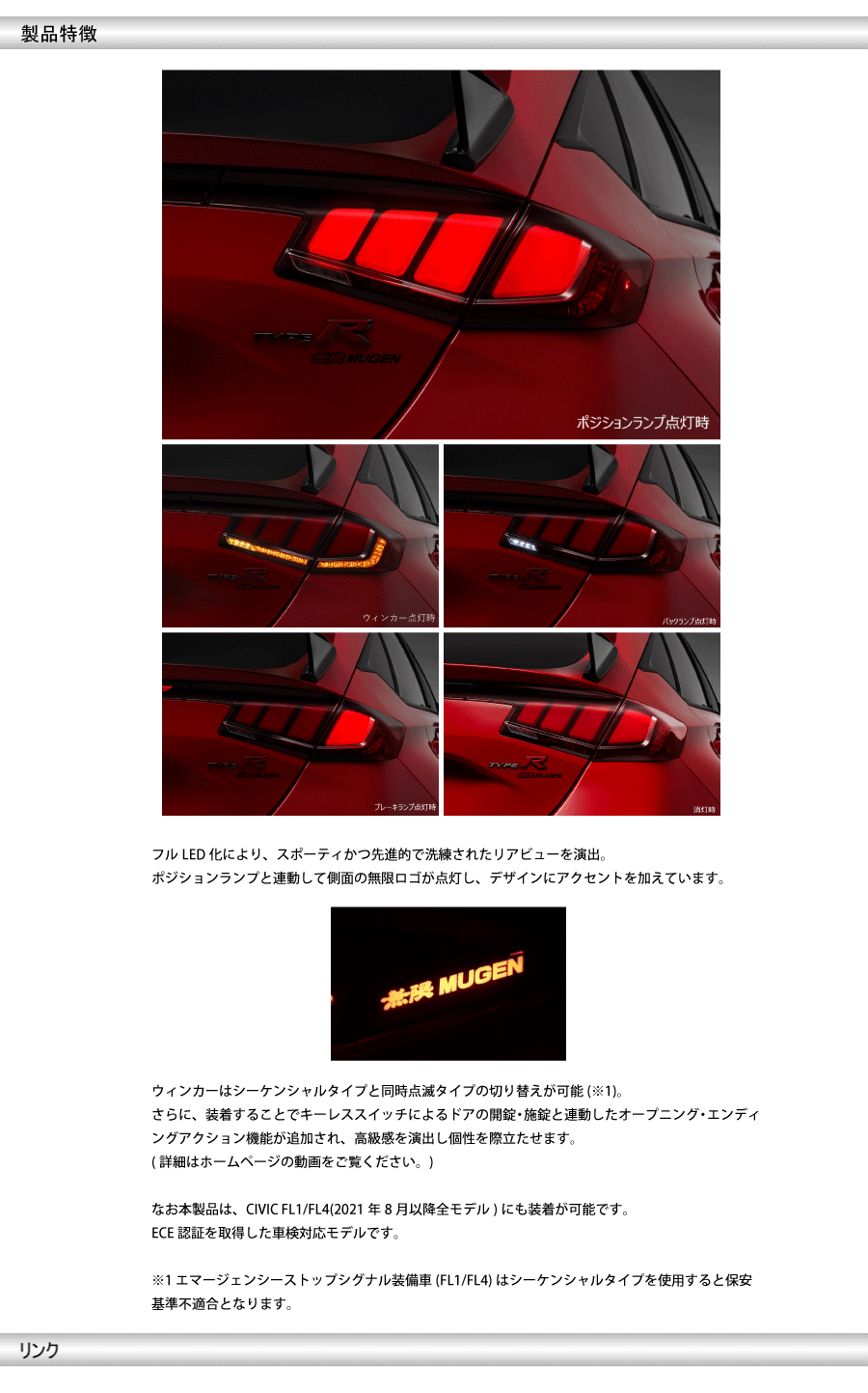 | ・フルLED化により、スポーティかつ先進的で洗練されたリアビューを演出。 ・ポジションランプと連動して側面の無限ロゴが点灯し、デザインにアクセントを加えています。 ・ウィンカーはシーケンシャルタイプと同時点滅タイプの切り替えが可能(※1)。 ・キーレススイッチによるドアの開錠・施錠と連動したオープニング・エンディングアクション機能が追加 なお本製品は、CIVIC FL1/FL4(2021年8月以降全モデル)にも装着が可能です。 ECE認証を取得した車検対応モデルです。 |