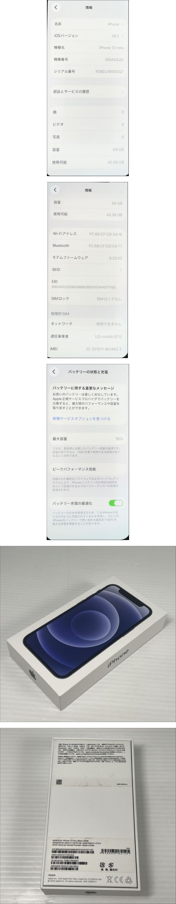 ※他 出品商品との「同梱発送不可」となります。 ※おまとめ依頼があった場合でも「個別取引」となりますので予めご了承くださいませ。 ※弊社指定の配送方法となりますので、配送方法変更不可となります。 (沖縄県は(60サイズ以上の商品)ゆうパックのみでの配送) ※領収書発行可能 (領収書は商品同梱となりますのでメール送信・別住所への郵送はできません) 領収書が必要な場合は、支払完了前までに取引ナビにてお知らせください。 ※落札より2日以上ご連絡が無い場合は「落札者都合でのキャンセル」となります。 ------------------------------------------------------------------------------------------- 【機種】iPhone 12 mini 【キャリア】Softbank系 【容量】64GB 【型式】MGA03J/A 【カラー】ブラック 【動作】通電確認済 ※充電可能/電源入ります(出品時) ※傷・汚れ有。長期保管の中古商品、現状でのお渡しとなりますので、画像にてご確認の上ご入札お願いいたします。美品・完品をお求めの方は入札をお控えくださいませ。 【バージョン】26.2 【IMEI】 ※利用制限(Softbank系):〇 【SIMロック】無し ※付属品につきまして、画像に写っているものが全てとなります。 ※アクティベーションロックは解除済みの商品となります。 ※商品の詳細につきまして、専門業者ではございませんのでお答えできかねる場合がございます。 ※状態に関して、経年劣化による、小傷や汚れ等はご了承くださいませ。 見落としがある可能性も御座いますので、詳細は画像にてご確認頂き、画像にてご判断頂ける方のみ御入札をお願い致します。 ※電化製品・精密機器等の保証はございません。 | |||