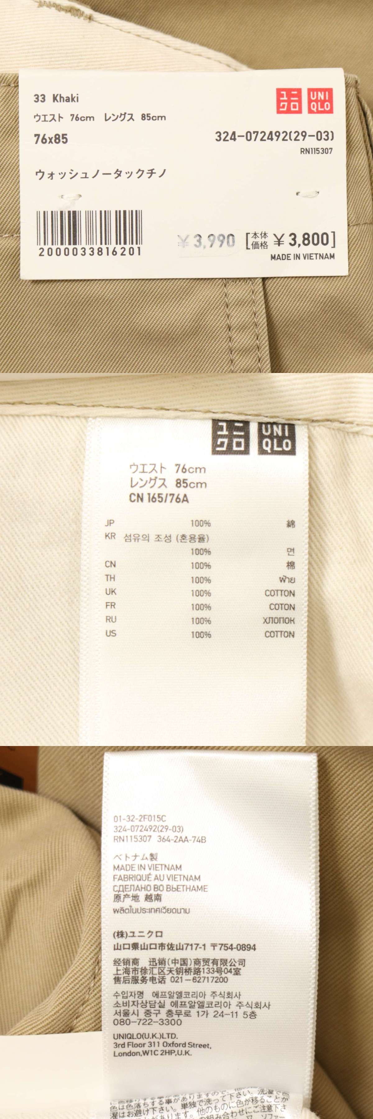 【新品 未使用】 UNIQLO ユニクロ 通年★ ウォッシュ ノータック チノ パンツ Sz.76 メンズの画像3