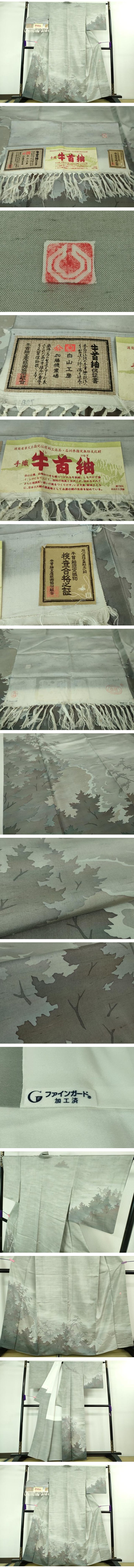 | 【正絹】 状態は接写画像のように 衿裏にホックシミがございますが その他表地は特に目立ったシミ汚れなどもなく大変良い状態です。 石川県の白峰村で生産されている牛首紬(うしくびつむぎ)は、 日本三大紬のなかで最も生産量が少ない織物です。 牛首紬は二匹の蚕が偶然作りだす玉繭を直接手で引き出して一本の糸にしていく 「のべ引き」という工程によって味わいのある節、美しい艶、滑らかな手触りが生まれます。 玉繭から引き出した太くしっかりとした糸によって堅牢度が高くなり、 別名「釘抜き紬」とも称されます。 複雑に絡み合った玉繭から一本の糸を作るには高度な熟練の技が要求され、 それこそが牛首紬の独自性を守っているのです。 また、牛首紬の特徴は 玉繭から手挽きする玉糸づくりと糸づくりから織りまでの 合計20にもわたる工程を一貫作業で生産していることです。 職人の手の温もりをたっぷりと含んで、 しなやかさとハリのある上質な地風が生まれます。 大変上質な極上の逸品になります。 お安く出品致しますので、是非この機会にいかがでしょうか?