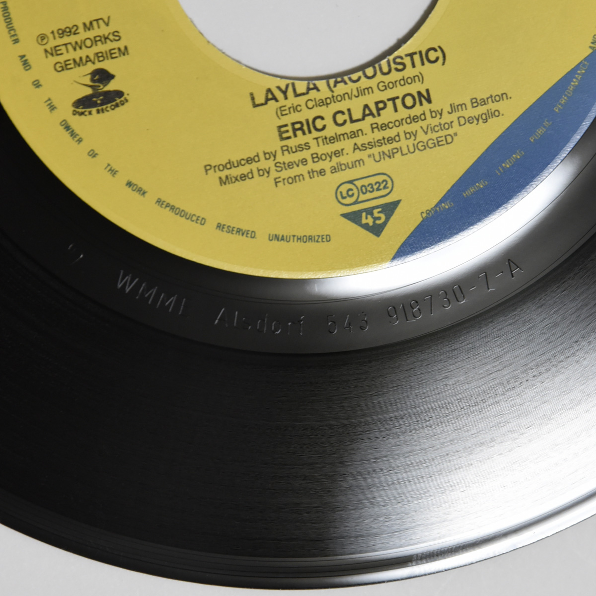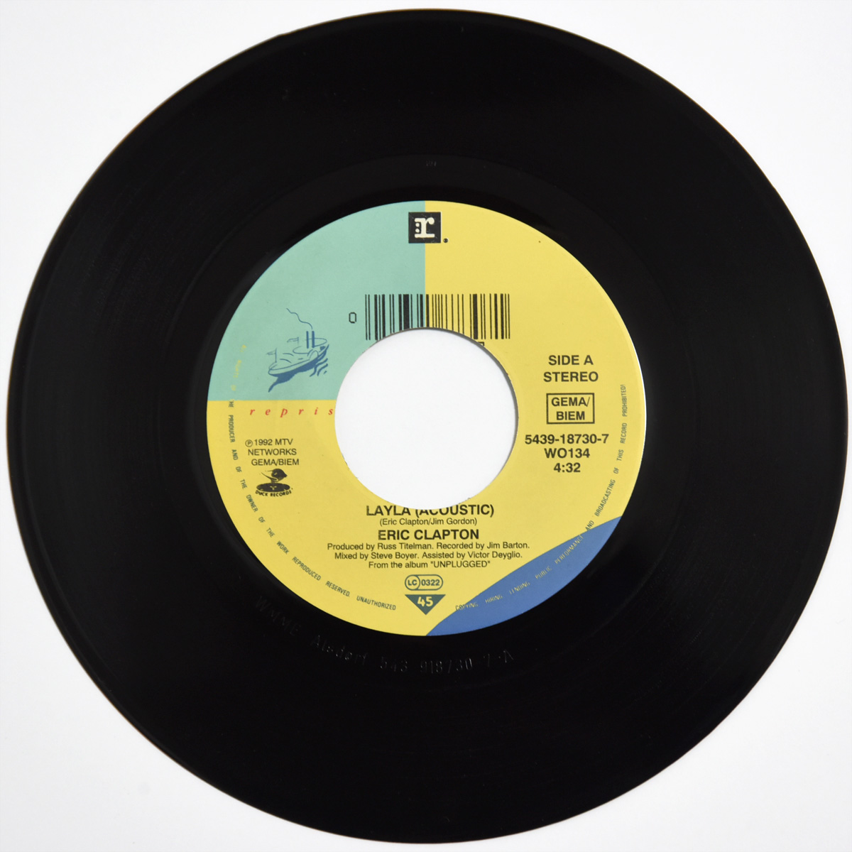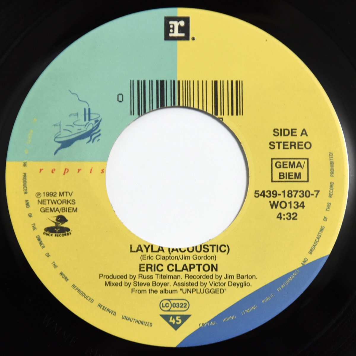 1992年、Eric ClaptonのReprise Recordsからリリースのアコースティック・ライブ・バージョンのLayla収録のオリジナルEPレコードの中古品です。