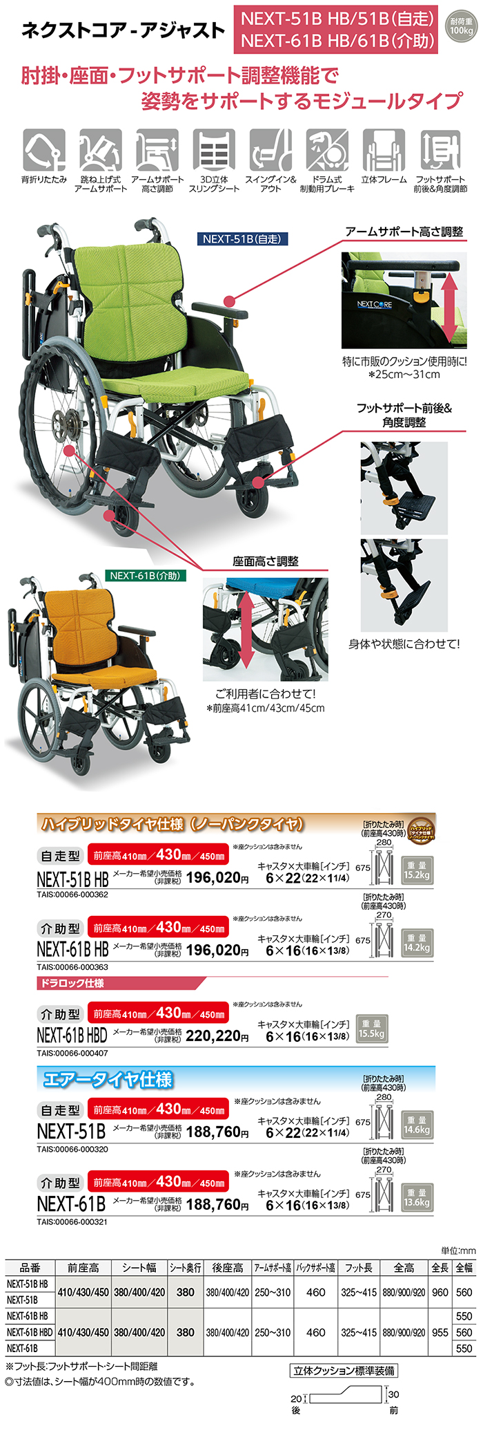 | ・メーカー:株式会社松永製作所 ・品名:ネクストコア アジャスト 自走用 NEXT-51B エアータイヤ仕様 座幅38cm ・メーカー希望小売価格:¥188,760(非課税) |